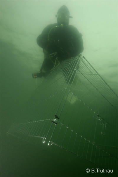 Das Besondere an dem Projekt in Biebesheim ist die Zusammenarbeit zwischen Tauchern und Anglern. Die Idee zu dem Versuch mit Hasenkäfigen wurde im Januar bei einer Arbeitsrunde von Anglern und Tauchern am Wechselsee besprochen und nun schon in die Tat umgesetzt. Gemeinsam für den Gewässerschutz wurden an mehreren Stellen unter Wasser jeweils 2m² große Hasenkäfige versenkt, verankert und Referenzflächen markiert. Denn es gibt einen Rückgang der Wasserpflanzen – in Biebesheim ist dieser signifikant. Das kann an den hohen Wassertemperaturen des vergangenen Sommers oder an besonderen Umweltbedingungen liegen. Aber möglicherweise auch an Fischarten, die den Seeboden nach Nahrung durchwühlen und – ähnlich wie Wildschweine – dabei den Boden durchwühlen. Um darüber Gewissheit zu erhalten, dienen die geschützten Bereiche der Hasenkäfige.